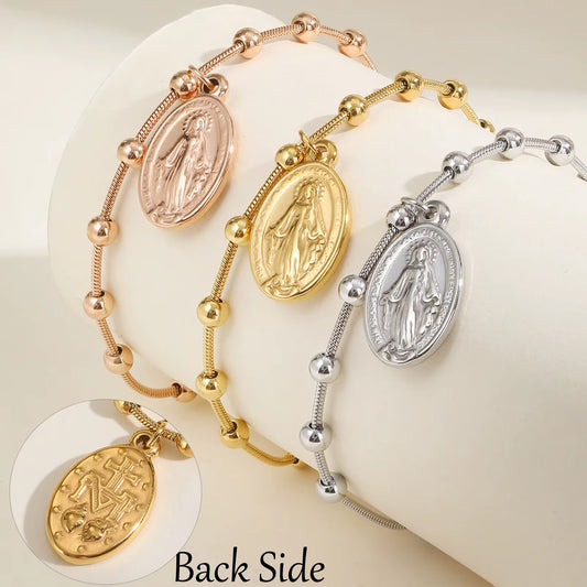 Double Sides Women Rosary Bracelets,Gold Plated Stainless Steel Religious Prayer Charm Bracelet,Cross Virgin Mary Bracelets